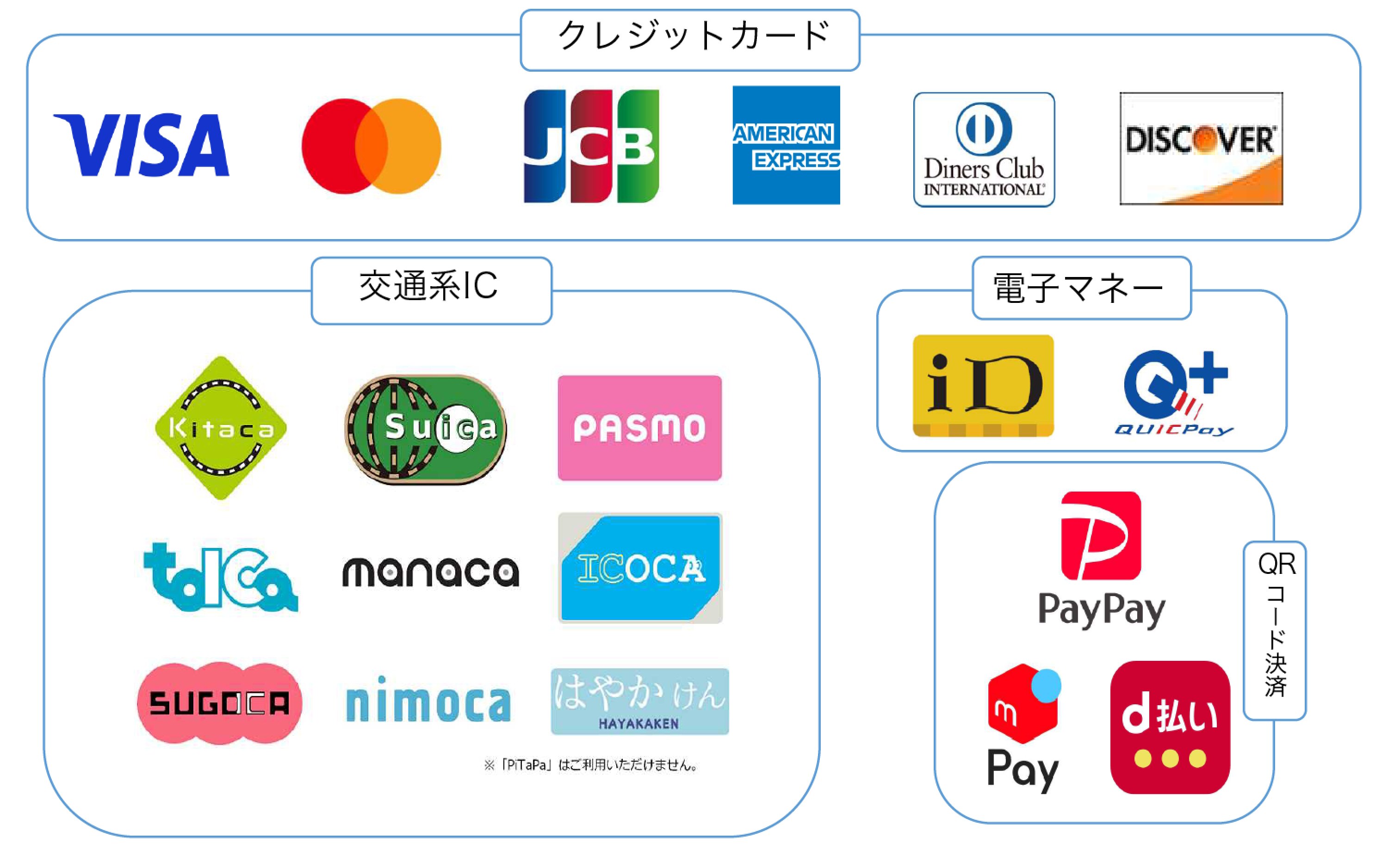 - クレジットカード、交通系IC、電子マネー、QRコード決済